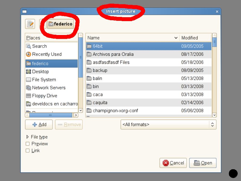This is “Insert/Picture/From file” from OpenOffice.org. It picked my home directory; not Documents, nor the GIMP's directory, either.