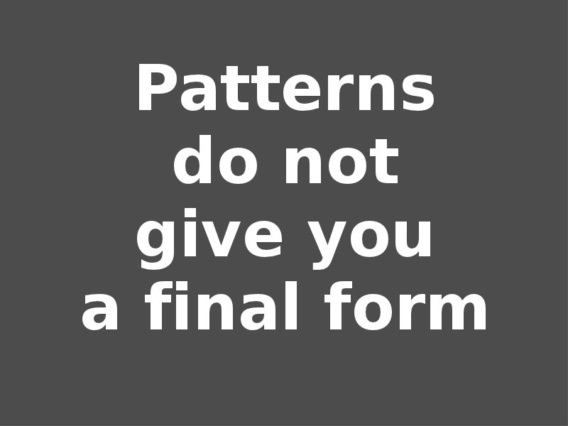 One nice thing about the patterns is that they don't impose a style. You don't get, “use this shape of flourishes for the handrail in a staircase”; instead you get a discussion for, “what makes a good staircase?”.