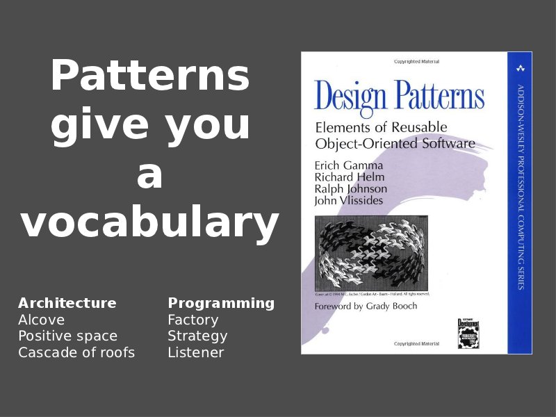 Instead, patterns let us give names to things that we often talk about. It's easier to say, “my object supports listeners for its properties”, than to say a more verbose, “this object has a method to which you can pass a function that will be called when the member variables of the object have their values changed”.