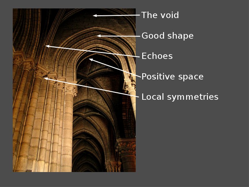 Local symmetries: each of the capitals on the false columns is symmetrical within itself. Each capital is different, but each one is locally symmetrical.