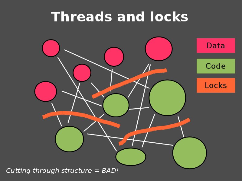 Cutting through existing structure is bad – you don't get any of the 15 properties. This is why programming with threads and locks is hard. At any point in the code, you don't know what locks should be in place, or their proper locking order.